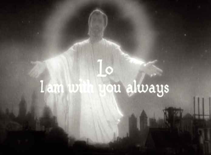Filmmakers, then, must decide whether or not to attempt to replicate and reinforce these familiar yet static images. Both approaches have been tried with varying results. Let’s take a look, for example, at a clip from Cecil B. DeMille’s silent film The King of Kings (1927). In this familiar scene, Jesus reveals himself to the disciples in the Upper Room after his resurrection. While you’re watching the scene, take note of how Jesus is portrayed: what he says, how he moves, that sort of thing.