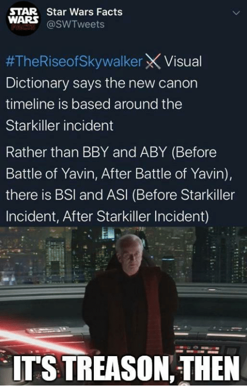 In Rise of Skywalker, however, we learn that Kylo’s teacher Snoke was created by Palpatine, and was presumably taught by Palpatine himself. Not only that, but every voice Kylo had ever heard tempting him to the Dark Side, which Kylo assumed was his grandfather Vader, or Snoke, had actually been Palpatine all along. So logically, this would make Kylo a Sith. He was taught Sith ways by a Sith master, albeit indirectly in some cases. He took a Sith weapon (a red lightsaber is specifically used by Sith, not just bad Force-users in general). He aspires to be as much like his grandfather Darth Vader as possible, most of all to extinguish the Light Side of the Force and wipe out the Jedi once and for all. In all but the honorific “Darth,” Kylo Ren IS a Sith in these movies. Even so, the canonical sources all list Kylo as a “Dark Side user” or at best “Leader of the Knights of Ren.” Abram’s quote is featured prominently on Ren’s Wikipedia page with nothing to contradict it. Perhaps the editors of the Star Wars lore are waiting until Rise of Skywalker is out of theaters to update these kinds of changes. But the inconsistency between directors, lore-keepers, and executives is mildly frustrating to me.
