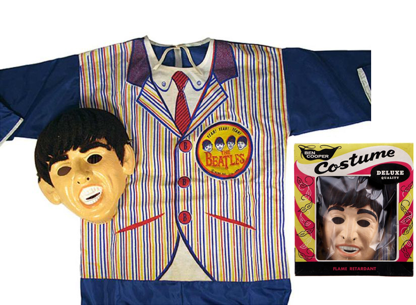 Other items, like a Beatles hair brush or Beatles nylon stockings, definitely came about for more cash-grabby reasons but are pretty innocuous. The weirdness begins, however, with items like the “Beatles costume,” which featured a t-shirt printed with a Beatles-style vest as well as a molded plastic mask depicting (allegedly) one of the Fab Four. I like to imagine how I would feel when being confronted on Halloween night by candy-demanding children in matching mop-headed death masks. Not to worry, though; according to the packaging, the masks are topped with “authentic hair.”