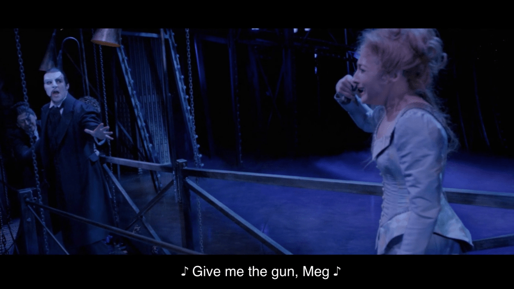 But there are some major differences as well. The Phantom spends the entire musical on Coney Island writing music and building wondrous machines instead of simply using it as a stepping stone to fame. Raoul is a main character in this version, although he is a total ass. He encourages Christine to go ahead and sing even after it’s revealed Erik is behind the entire thing, because he’s blown all of their money on drinking and gambling and is in deep debt. If any Raoul deserved to be shot in the groin, it’s this one. Meg Giry is also more prominent in this version, taking the role of Darius from the book as the jealous protegee who feels she deserves the Phantom’s riches and recognition. Meg goes a step further, however, attempting to kill both Gustave and herself in a murder-suicide and then accidently killing Christine anyway.